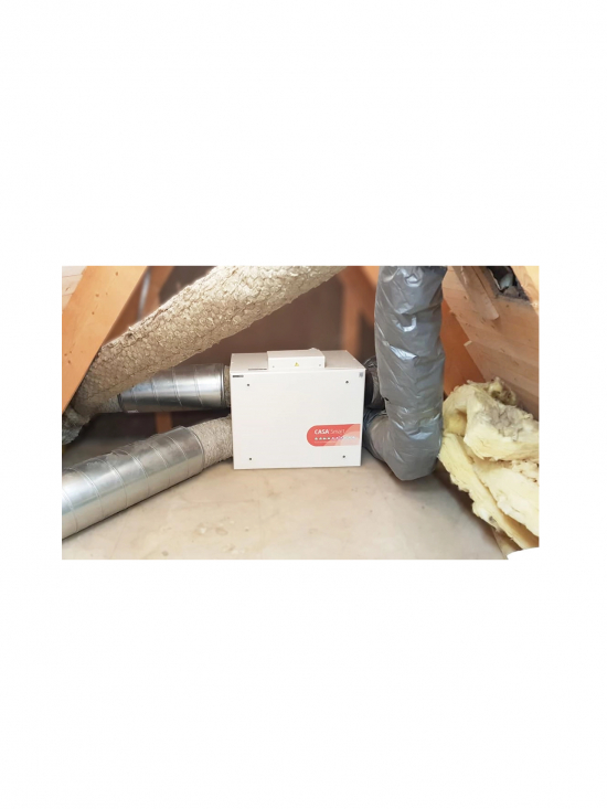 Swegon Casa R5-H, ett effektivt bostadsaggregat med kompakta mått (702 x 614 x 479 mm, Ø160 mm) och en roterande värmeväxlare, perfekt för hus, mindre kontor och andra utrymmen. Detta ventilationsaggregat är designat för vindsinstallation och har horisontella kanalanslutningar som underlättar installationen genom takluckan.